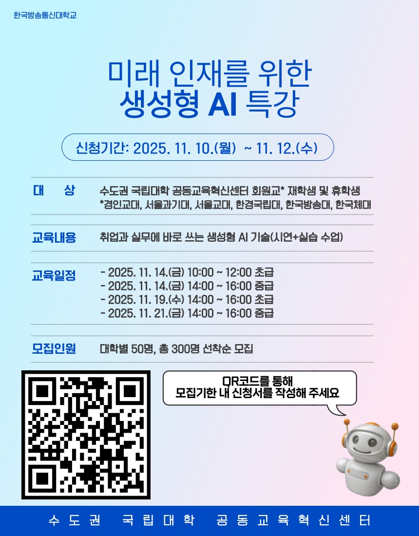 수도권 국립대학 공동교육혁신센터에서는 인공지능 기술 발전과 디지털 전환 가속화에 대응하여 대학생들의 실무 역량 강화를 위한 「미래 인재를 위한 생성형 AI 특강」을 아래와 같이 운영합니다. 많은 관심과 참여 바랍니다.